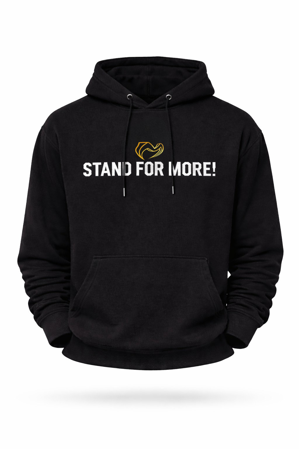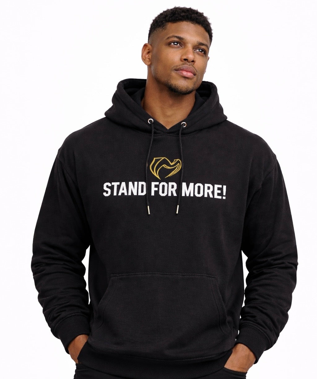 The Stand For More Hoodie is designed for those who refuse to settle and choose to show up with purpose every day. Featuring a bold “STAND FOR MORE!” print across the chest and our signature gold emblem above it, this piece blends motivation with modern streetwear style.